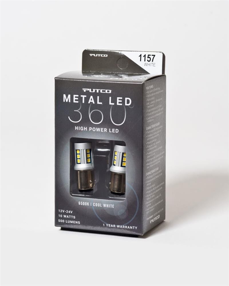 It's time to stop running those old and dim OEM bulbs and go with the most technologically advanced automotive aftermarket LED bulb available from Putco. Bright up the night and let everyone see your vehicle from all around with the Putco Metal 360° LED bulb. Each state-of-the-art LED bulb features 15 LED chips mounted in a 360° arrangement providing a spectacular amount of light output in all directions. To deter the biggest enemy of light bulbs (heat) these LEDs are built with a copper core that allows for high-efficiency heat control as well as a more powerful light output at 500 Lumens.The Putco Metal 360 bulbs are offered in various colors such as white, amber, red, green, and blue! Designed to work with turn signals, running lights, and more. These LEDs are perfect replacement bulbs for any SUV, car or truck. Not only do these lights make your vehicle more visible to other drivers, but they also help increase your driving safety. With a cleaner, brighter light your vehicle can change from an OEM look to a sleek Aftermarket look in minutes. The Metal 360 bulbs were designed to be a more economical replacement bulb. They use much less power then a standard incandescent bulb, burn cooler and run up to 50,000 hours!So brighten up your ride with these Metal 360° replacement LED bulbs today and you'll most likely never have to replace them!Manufactured by Putco of Des Moines, IA.