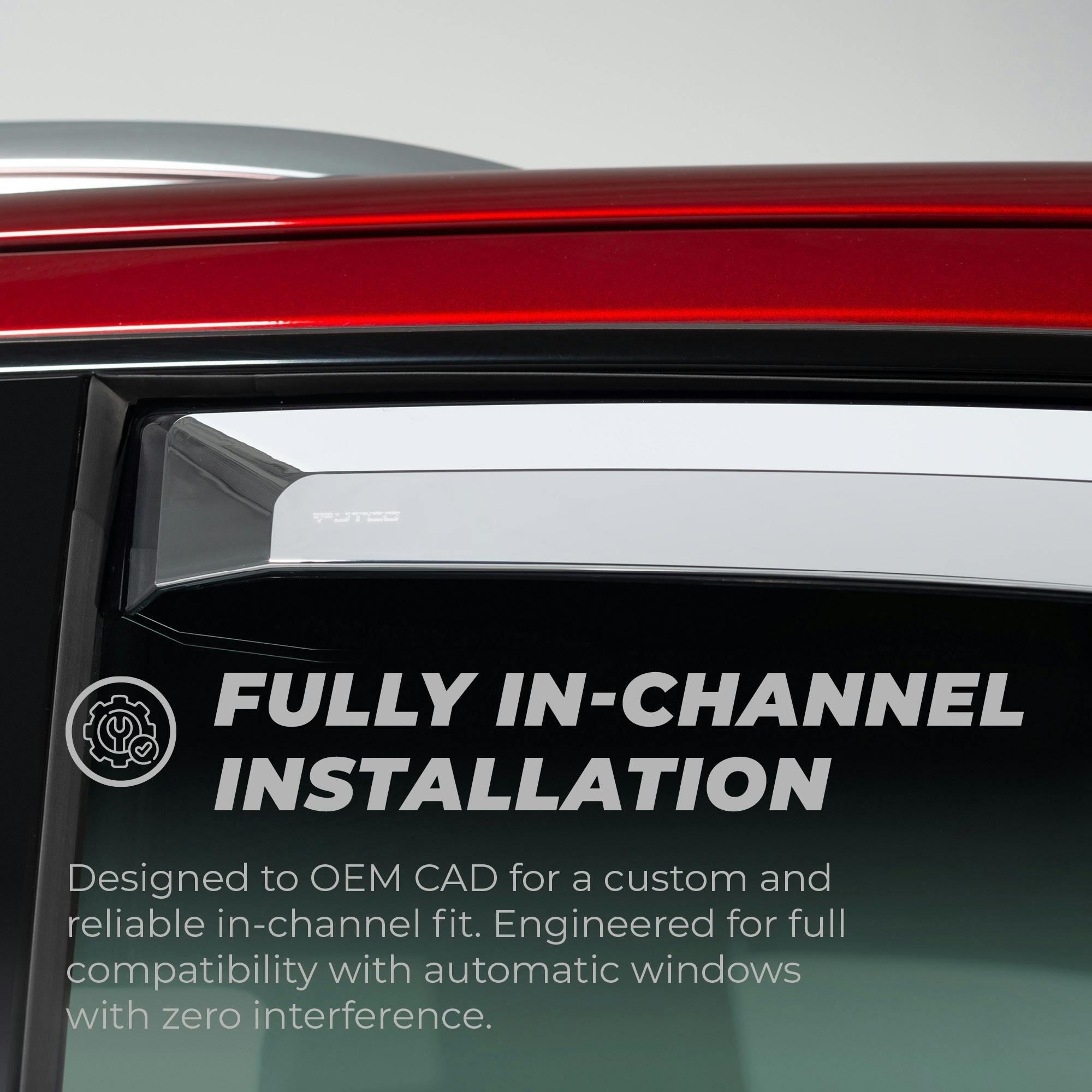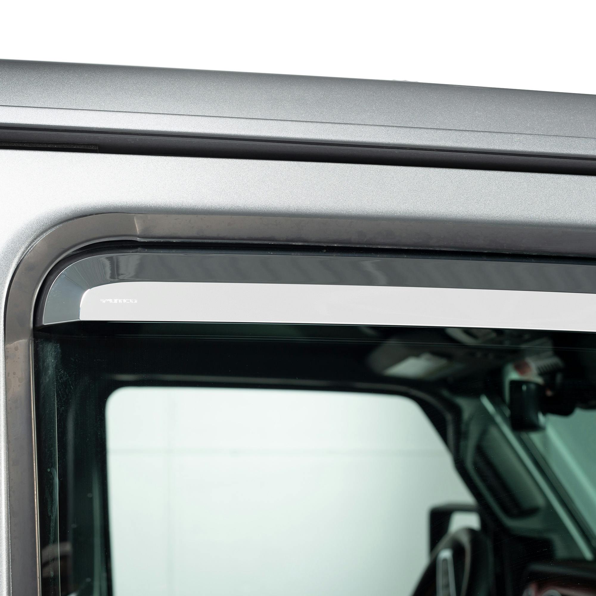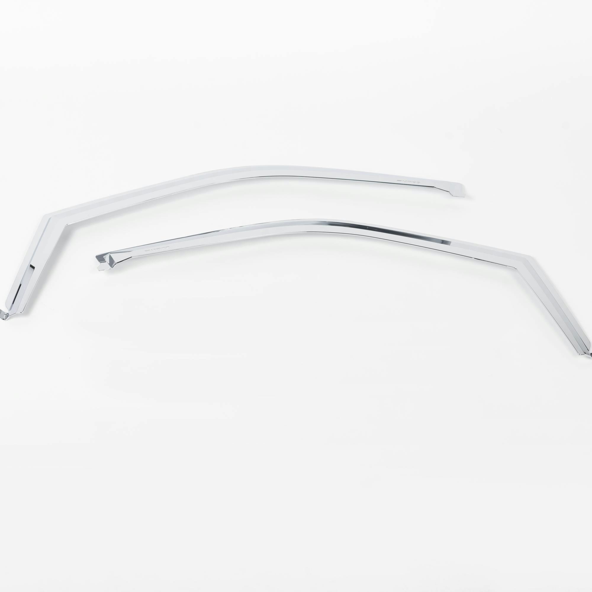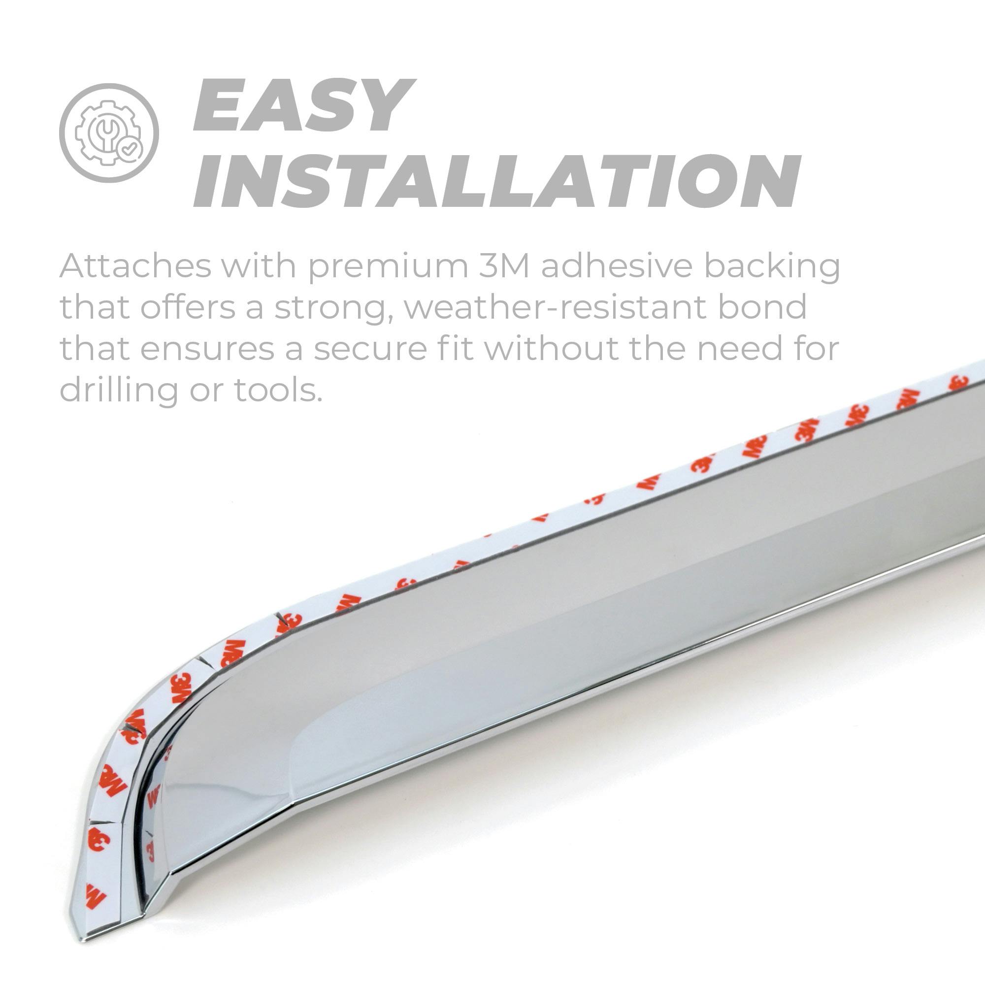 Enhance your truck or SUV with the exceptional Putco Element Chrome Window Deflectors. Crafted from a combination of durable and lightweight materials, these deflectors offer a sleek and eye-catching chrome finish that elevates the exterior aesthetics of your vehicle.Experience the perfect balance of functionality and style with these in-channel window deflectors. They enable the circulation of fresh air within your vehicle, ensuring a comfortable and refreshing atmosphere while effectively keeping rain, wind, and other weather elements at bay. Additionally, their innovative design minimizes wind noise, providing you with a serene driving experience.Versatility is a key feature of the Putco Element Chrome Window Deflectors. With their precisely engineered construction, they effortlessly accommodate a wide range of trucks, SUVs, and cars, ensuring a seamless fit on various vehicle models. Moreover, installing them is a breeze!, thanks to the convenient pre-applied 3M automotive tape that allows for a quick and hassle-free installation process.Upgrade with the best-in-class window deflectors with the Putco Element Chrome Window Visors and enjoy the perfect combination of enhanced aesthetics, improved ventilation, and reduced wind noise!